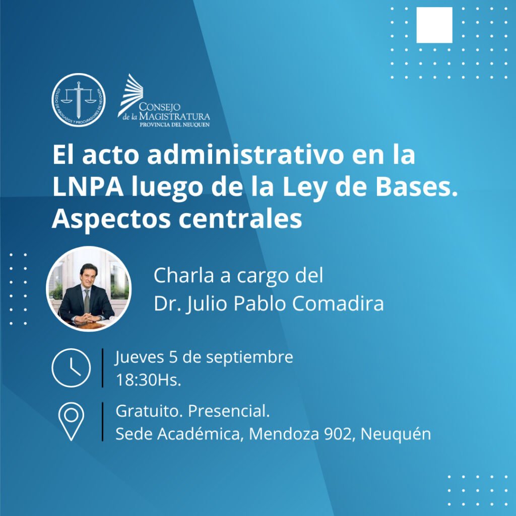 Te invitamos a participar de la charla abierta “El acto administrativo en la LNPA luego de la Ley de Bases. Aspectos centrales”. Charla a cargo del Dr. Julio Pablo Comadira: Abogado, Magister en Derecho Administrativo, Doctor en Derecho con la máxima calificación de summa cum laude, por la Universidad Austral (Argentina), También es diplomado en Contratos Públicos e Infraestructura Estatal y en Derecho de los Hidrocarburos.