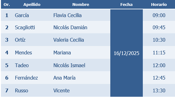 Se hace saber a los interesados que en el marco del Concurso Nº269 destinado a cubrir: Un (1) cargo de Juez de Primera Instancia, categoría MF3, con destino al Colegio de Jueces en lo Laboral, como Juez Laboral N° 3, con asiento de funciones en la ciudad de Neuquén, se realizarán las entrevistas personales de los postulantes de acuerdo al siguiente cronograma y conforme al orden de mérito emergente de la sumatoria de las dos etapas anteriores.
