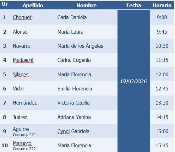 Se hace saber a los interesados que, en el marco de los Concursos N° 271 y 272, destinados a cubrir dos (2) cargos de Defensor/a Público/a Civil, categoría MF4, con destino a la Defensoría Pública Civil N° 10 de la I Circunscripción Judicial, con asiento en la ciudad de Neuquén, y a la Defensoría Pública Civil N° 2 de la I Circunscripción Judicial, con asiento de funciones en la ciudad de Rincón de los Sauces, respectivamente, se realizarán las entrevistas personales de los postulantes de acuerdo con el cronograma que se detalla a continuación y conforme al orden de mérito emergente de la sumatoria de las dos etapas anteriores.