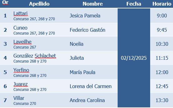 Se hace saber a los interesados que en el marco de los Concursos Nº267, 268 y 270 destinados a cubrir: Un (1) cargo de Fiscal del Caso, categoría MF4, con destino a la Unidad Fiscal Única de la II Circunscripción Judicial, con asiento de funciones en la ciudad de Cutral Có; Un (1) cargo de Fiscal del Caso, categoría MF4, con destino a la I Circunscripción Judicial, con asiento de funciones en la ciudad de Neuquén y Un (1) cargo de Fiscal del Caso, categoría MF4, con destino a la I Circunscripción Judicial, con asiento de funciones en la ciudad de Neuquén; respectivamente, se realizarán las entrevistas personales de los postulantes de acuerdo al siguiente cronograma y conforme al orden de mérito emergente de la sumatoria de las dos etapas anteriores.