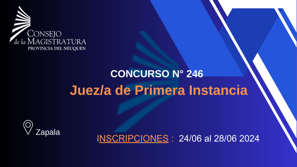El Consejo de la Magistratura de la Provincia del Neuquén, convoca a Concurso Público de Antecedentes y Oposición N° 246 para cubrir un cargo de Juez/a de Primera Instancia, con destino al fuero Procesal Administrativo del Interior, para la II, III, IV y V Circunscripciones Judiciales, con asiento de funciones en la ciudad de Zapala. Categoría MF3